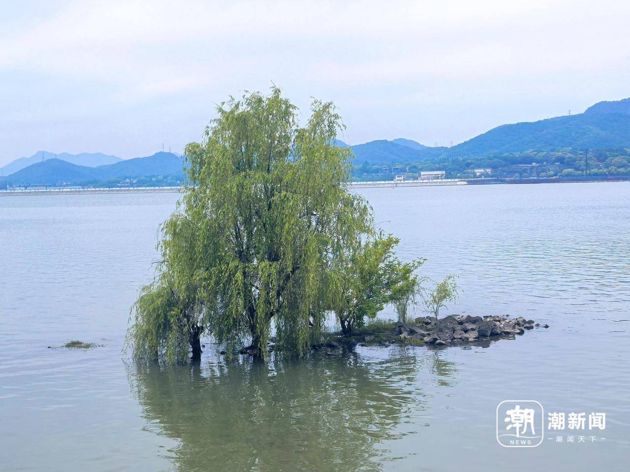 离岸十余米,一抹盎然绿意在江中舒展。与阿陆此前拍摄的像片不同,彼时柳树眼下大片江滩露馅,此刻江水涨得高,仅几许石块从树下迷糊探露面来。