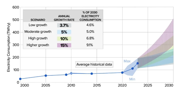 上周,好意思国电力陆续协会(EPRI)发布了一份对于东谈主工智能电力需求的白皮书,这份陈说开篇就指出:“预测到 2030 年,仅好意思国数据中心的总和据中心电力耗尽就可能加多一倍以上,达到 166%。”