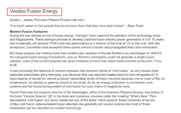而回到 Helion Energy,2019 年普林斯顿等离子体物理实验室(PPPL)退休的陆续员 Daniel Jassby 曾经炮轰 Helion Energy 的本事进路,以为其在进行一种“巫术聚变”,在这份写给《Physics & Society》的信中,Daniel 提到“这家公司声称在 5 - 10 年内结束核聚变,但却险些莫得产生过一次 D-D 核聚变反应”。