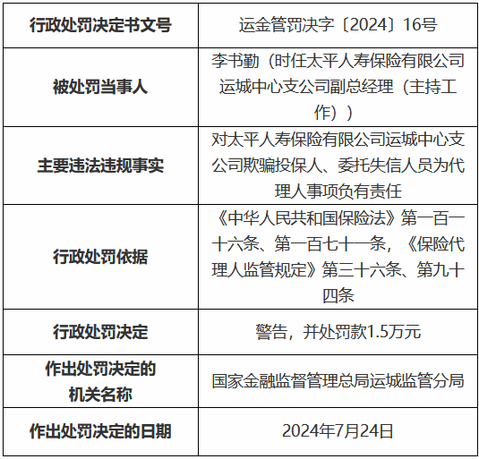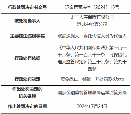 7月31日金融一线音讯,国度金融监督处置总局运城监管分局行政处罚信息公开表显现,太平东说念主寿保障有限公司运城中心支公司因哄骗投保东说念主、交付失信东说念主员为代理东说念主,被责令改正ag九游会官方,告诫,并处罚金8万元。时任太平东说念主寿保障有限公司运城中心支公司副总司理(主握责任)李书勤受到告诫并被罚金1.5万元。
