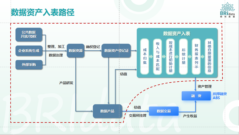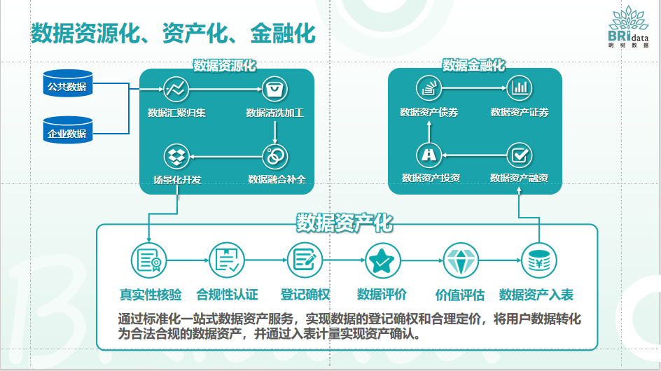 数据资源化即是企业授权拿到数据,通过清洗加工、数据治理,变成资源目次。而数据财富入表,即是按照顾帐准则进行实在性核验、合规性认证、登记确权、数据评价、价值评估,临了计入财富欠债表,这是数据财富化。既然它能参预财富欠债表,那就跟其他多样金融技巧买通了,就像等闲融资看三表,相应的银行债券融资,财富证券化齐成为可能。
