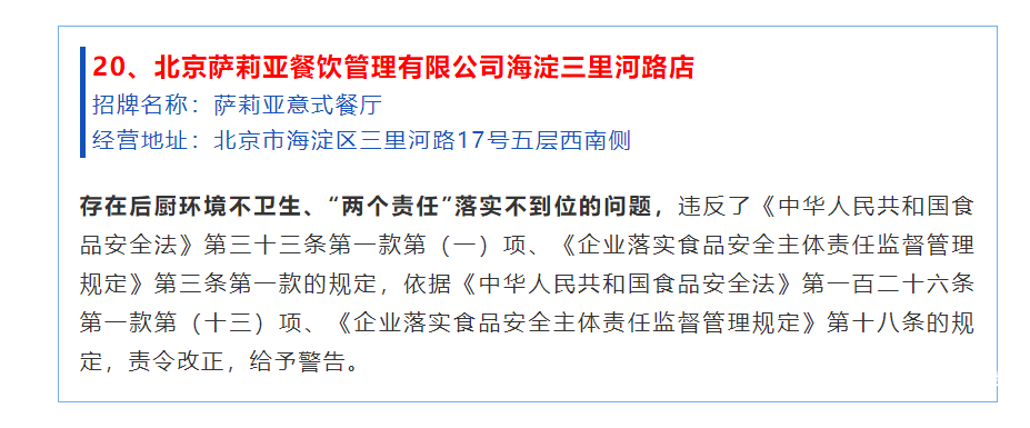 据海淀区商场监管局通报,北京萨莉亚餐饮处理有限公司海淀三里河路店被查出存在后厨环境不卫生、“两个职守”落实不到位的问题,海淀区商场监管局称,涉事餐厅违背了《中华东谈主民共和国食物安全法》第三十三条第一款第(一)项、《企业落实食物安全主体职守监督处理礼貌》第三条第一款的礼貌,依据《中华东谈主民共和国食物安全法》第一百二十六条第一款第(十三)项、《企业落实食物安全主体职守监督处理礼貌》第十八条的礼貌,责令改正,予以告诫。