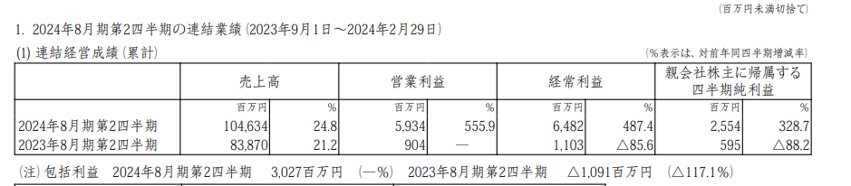 4月10日,萨莉亚公布了2024财年Q2团结财报,财报披露,2024财年上半年(2023年9月1日~2024年2月29日),萨莉亚贸易额同比增长24.8%至1046亿日元(约合49亿东谈主民币),贸易利润同比增长555.9%至59.34亿日元(约合3亿东谈主民币),归母净利润同比增长328.7%至25.54亿日元(约合1亿东谈主民币)。