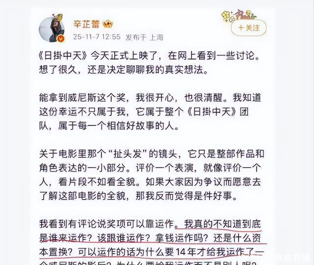 林轻吟 剪辑| 林轻吟 序论 袭击戛纳,质疑威尼斯,辣评东京,三大电影节奖项,全被骂了个遍。 11月7日,疑似郝蕾一又友圈发文怒揭获奖黑幕,当事东说念主辛芷蕾现身6连问反击! 老戏骨撕影后大瓜,这究竟是奈何一趟事?