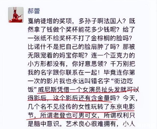 疑似郝蕾掀桌 最近文娱圈真干涉,大瓜接连不休,从台前撕到幕后,从演员撕到导演、编剧、制片东说念主,让东说念主看的头昏脑闷。 11月7日,老戏骨郝蕾也掀桌,疑似发长文质疑三大电影节奖项的刚正性。