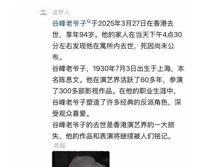 谷峰一世扮演了300多部影视作品,是一个老戏骨,业绩得胜的他一世光棍,也莫得孩子。此前他也被大众称为演艺圈最长命的东说念主,不外再健康的身体也抵不外年龄,在3月月底,谷峰在家中离世,此前并莫得传出有什么彰着疾病,94岁的年龄也不错说是寿终正寝了。 对于死因,家东说念主莫得对外公布,不外94岁的年龄应该仅仅当然界的衣食住行。谷峰莫得成婚ag九游会官网,也莫得孩子,而他发奋这一世所获取的财产也只可由旁系支属接受了。