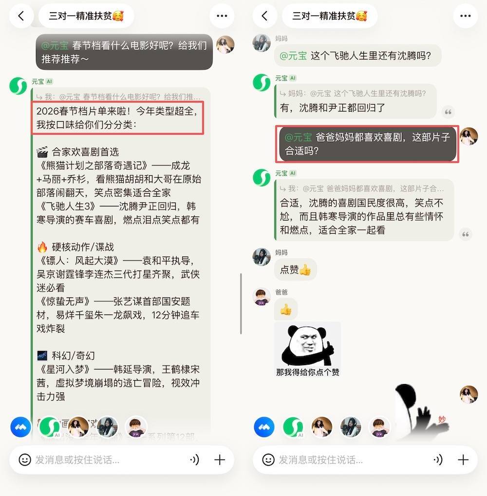 附进春节,家里接头的话题也转到了春节看什么电影、去哪儿玩。我也顺遂@了元宝,问它春节档有什么电影值得看。