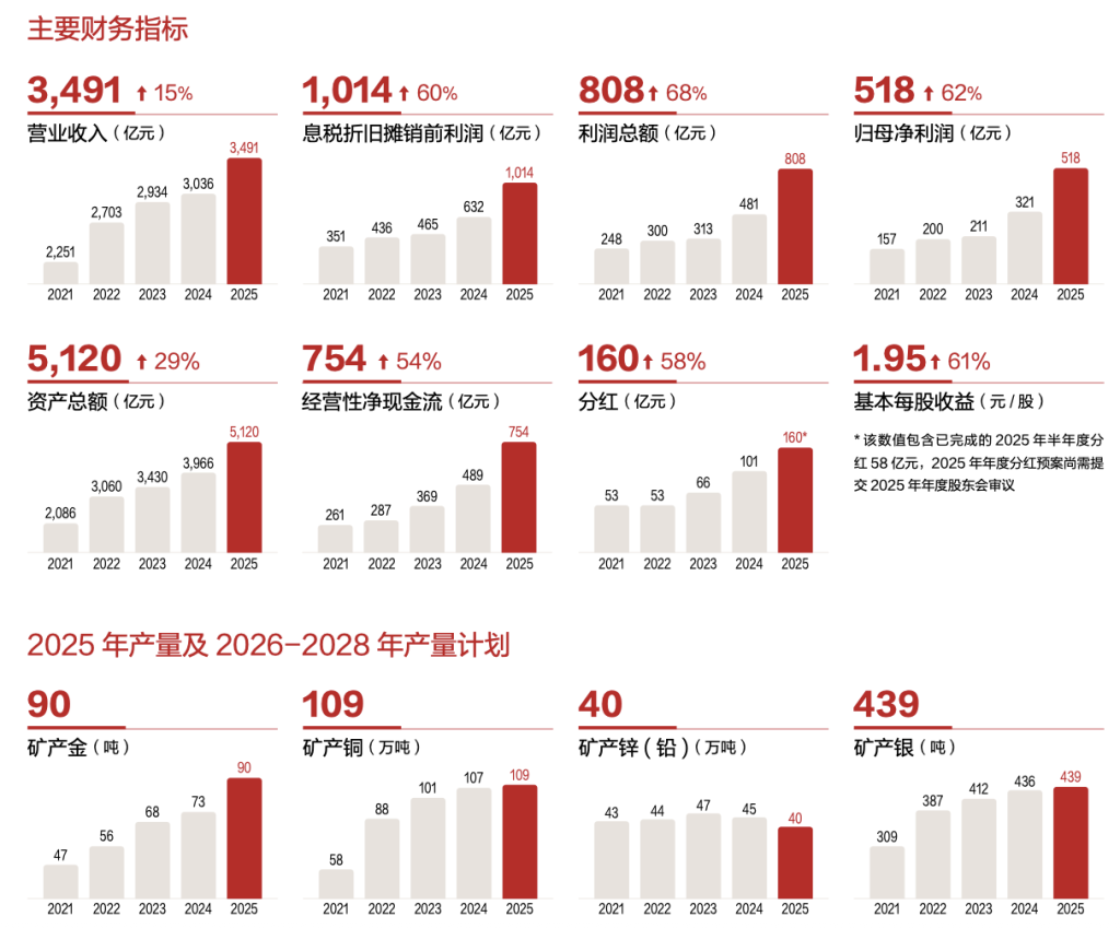 把柄紫金矿业本年2月发布的《公司三年(2026—2028年)主要矿产物产量筹画和2035年长进标的撮要》,公司明确2026年矿产金产量标的为105吨,2028年进步至130吨–140吨,较2025年90吨的产量水平增长44%–56%,一举脱落此前100吨–110吨的筹画标的。与此同期,矿产铜产量将从2025年的109万吨进步至2028年的150万吨–160万吨,增幅达38%–47%。