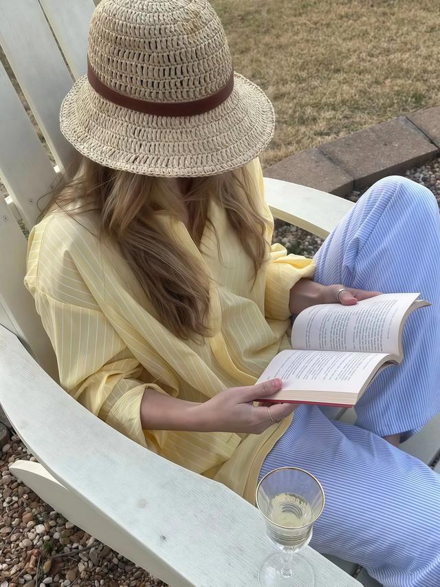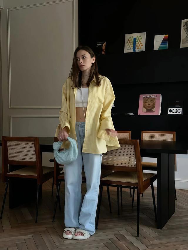 要提防的是蓝色尽量选浅蓝或者雾蓝,不要选深藏蓝,深蓝色和奶黄色放在全部色差太大,穿出来会有一种很割裂的嗅觉,浅蓝和奶黄才是信得过的春日绝配。